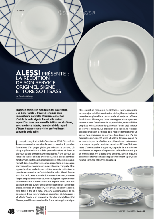 Produite en Allemagne, dans une région historiquement reconnue pour l’excellence de sa porcelaine, cette réédition perpétue le haut niveau de qualité qui faisait déjà la force du service originel. La précision des lignes, la justesse des proportions et la finesse de la matière témoignent d’un savoir-faire rigoureux, au service d’un dessin qui n’a rien perdu de sa singularité. Avec « La Bella Tavola », Alessi ne se contente pas de rééditer une pièce de son patrimoine. La marque rappelle combien la vision d’Ettore Sottsass reste d’une actualité frappante, capable de transformer la table en un espace d’expression culturelle autant que de convivialité. Un classicisme assumé, jamais figé, qui continue de faire de chaque repas un moment à part, entre rigueur formelle et liberté d’usage.