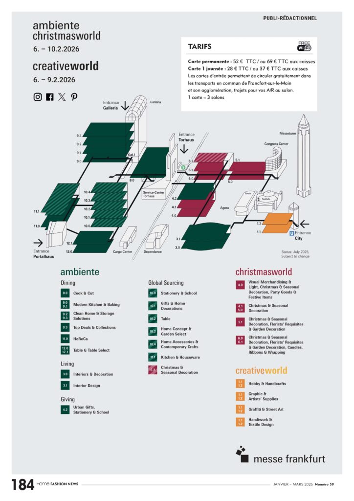 C’est cette diversité, alliée à la puissance du parc des expositions de Francfort — l’un des plus vastes au monde avec ses 17 niveaux de halls —, qui vaut à Ambiente son statut incontesté de plus grand salon international des biens de consommation. Un statut d’autant plus affirmé que l’événement se tient simultanément avec Christmasworld (Halls 4.0, 4.1, 5.0, 5.1, 6.0, 6.1, 6.2) et Creativeworld (Halls 1.1 et 1.2), créant une synergie unique entre art de vivre, décoration festive et créativité au sens large.