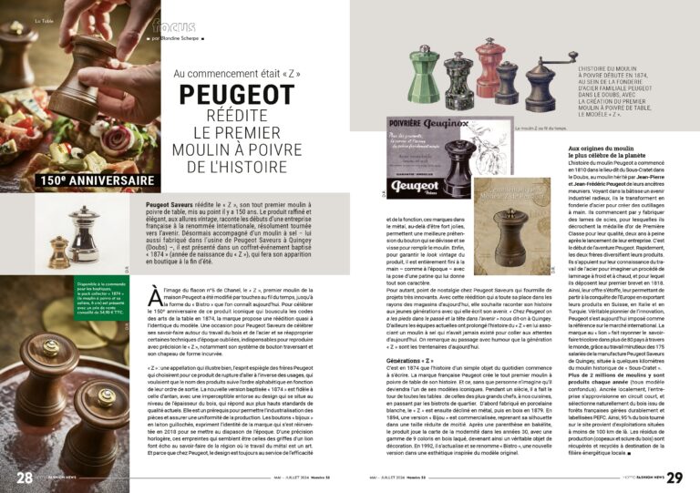 Peugeot Saveurs réédite le « Z », son tout premier moulin à poivre de table, mis au point il y a 150 ans. Le produit raffiné et élégant, aux allures vintage, raconte les débuts d’une entreprise française à la renommée internationale, résolument tournée vers l’avenir. Désormais accompagné d’un moulin à sel – lui aussi fabriqué dans l’usine de Peugeot Saveurs à Quingey (Doubs) –, il est présenté dans un coffret-événement baptisé « 1874 » (année de naissance du « Z »), qui fera son apparition en boutique à la fin d’été.