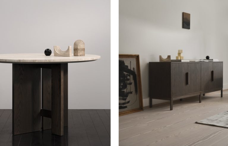 Pensée comme un ensemble cohérent, la collection « Axo » se distingue par des proportions sculpturales et une écriture formelle maîtrisée, héritée de la culture architecturale de ses designers. Tables, buffets et vitrines déclinent un langage épuré, où la géométrie précise dialogue avec des textures chaleureuses. Le chêne, décliné en finitions naturelle ou foncée, occupe une place centrale, tout comme le travertin, choisi pour son caractère vivant et singulier, chaque pièce révélant des veines uniques.