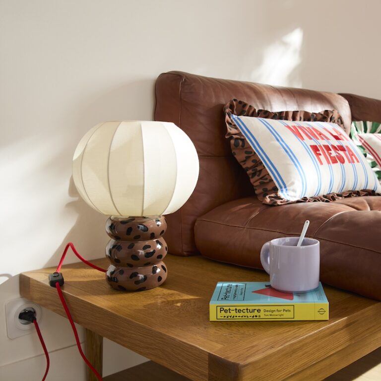 Entre léopard inattendu, rayures rétro et quadrillage d’écolier, les motifs se croisent et les teintes vitaminées insufflent de la bonne humeur à l’intérieur. Lampes, tapis, coussins, miroirs ou plateaux se parent de messages optimistes et d’une touche ludique fidèle à l’univers de la créatrice.