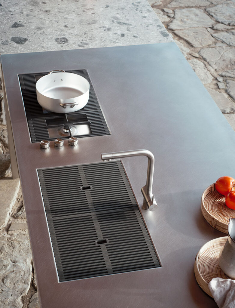 « Williamsburg Outdoor » offre à Cesar l’occasion de proposer une lecture contemporaine de la cuisine d’extérieur, pensée non comme une simple déclinaison technique de l’espace intérieur, mais comme un environnement autonome à part entière. Le projet s’articule autour du concept de poste de travail, structuré pour accueillir préparation, partage et convivialité, dans une continuité esthétique et fonctionnelle fidèle à l’univers de la marque.