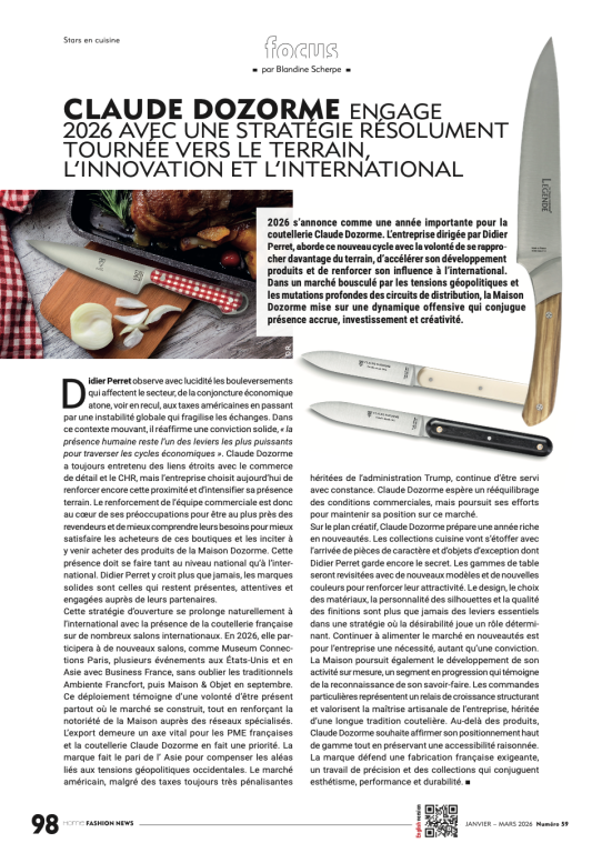 2026 s’annonce comme une année importante pour la coutellerie Claude Dozorme. L’entreprise dirigée par Didier Perret aborde ce nouveau cycle avec la volonté de se rapprocher davantage du terrain, d’accélérer son développement produits et de renforcer son influence à l’international. Dans un marché bousculé par les tensions géopolitiques et les mutations profondes des circuits de distribution, la Maison Dozorme mise sur une dynamique offensive qui conjugue présence accrue, investissement et créativité.
