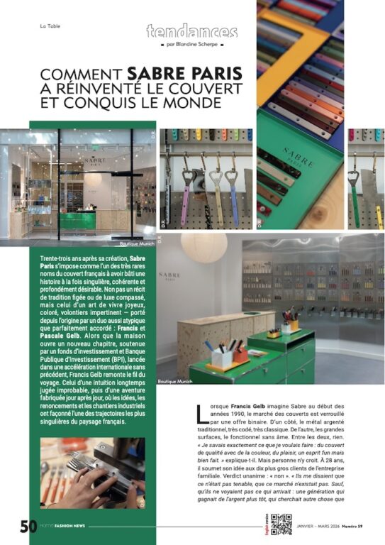Cette transition intervient dans un contexte particulièrement porteur : en 2025, Sabre a enregistré une croissance de +40 %, confirmant l’attractivité de son positionnement et la pertinence de son modèle. Présente dans plus de 50 pays, la maison atteindra 23 millions d’euros de chiffre d’affaires — une trajectoire portée par le succès durable de sa collection iconique « Bistro », par la richesse de son offre créative et par la montée en puissance du triptyque B2B, e-commerce, retail. L’ambition affichée est désormais de dépasser les 50 millions d’euros d’ici 2030, tout en continuant à faire rayonner une créativité française joyeuse, libre et accessible.