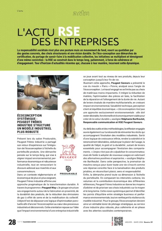 Present at the Produrable trade show, Peugeot Frères Industrie shared feedback on integrating eco-design across its entire product portfolio. Conceived as a long-term approach, this initiative aims to align environmental impact, economic performance and industrial robustness, while renewing the narrative addressed to markets and consumers alike. In an increasingly demanding regulatory and economic environment, Peugeot Frères Industrie asserts a pragmatic approach to sustainable transformation. Through the “Peugeot Way” programme, the group structures its commitments around local manufacturing, product durability, the reduction of greenhouse gas emissions and collective mobilisation. The objective is to move beyond a logic of isolated optimisation and firmly anchor eco-design at the heart of industrial and decision-making processes. This orientation is based on the conviction that the environmental impact of an industrial company is primarily determined by its products, from design through to end of life. Illustrating this approach, Peugeot Saveurs presented the case of the Paris pepper mill, analysed through the lens of eco-design. The work undertaken goes far beyond the selection of lower-impact materials. It includes material reduction, optimisation of wooden components, easier repair and extended product lifespan. These levers are assessed using a multifactorial approach that combines environmental impact, technical feasibility, customer perception and economic balance. “Eco-design is not an exclusively environmental approach: it must remain desirable, functional and economically viable in order to create lasting value,” emphasises Stéphanie Barthoulot, Head of Communication and CSR at Peugeot Saveurs.