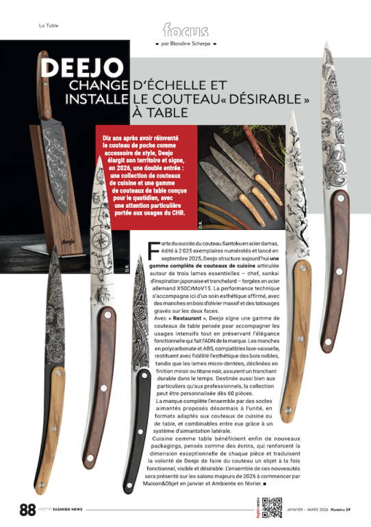 Dix ans après avoir réinventé le couteau de poche comme accessoire de style, Deejo élargit son territoire et signe, en 2026, une double entrée : une collection de couteaux de cuisine et une gamme de couteaux de table conçue pour le quotidien, avec une attention particulière portée aux usages du CHR.