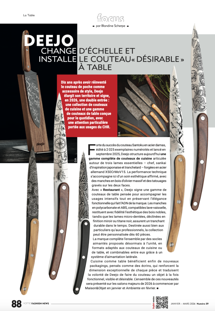 Ten years after reinventing the pocket knife as a style accessory, Deejo is expanding its scope. In 2026, the brand makes a double debut with a collection of kitchen knives and a range of table knives designed for everyday use. Particular attention is paid to the needs of the hospitality and foodservice sector.