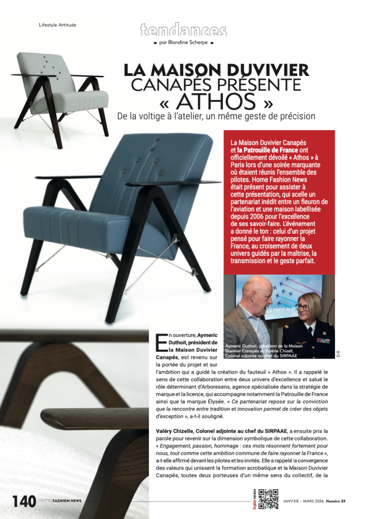 Duvivier Canapés and the Patrouille de France officially unveiled “Athos” in Paris during a landmark evening that brought together all the pilots. Home Fashion News attended the event, which sealed an unprecedented partnership between a flagship of French aviation and a house certified since 2006 for the excellence of its craftsmanship. The evening set the tone for a project designed to showcase France, at the crossroads of two worlds guided by mastery, transmission and the pursuit of the perfect gesture.