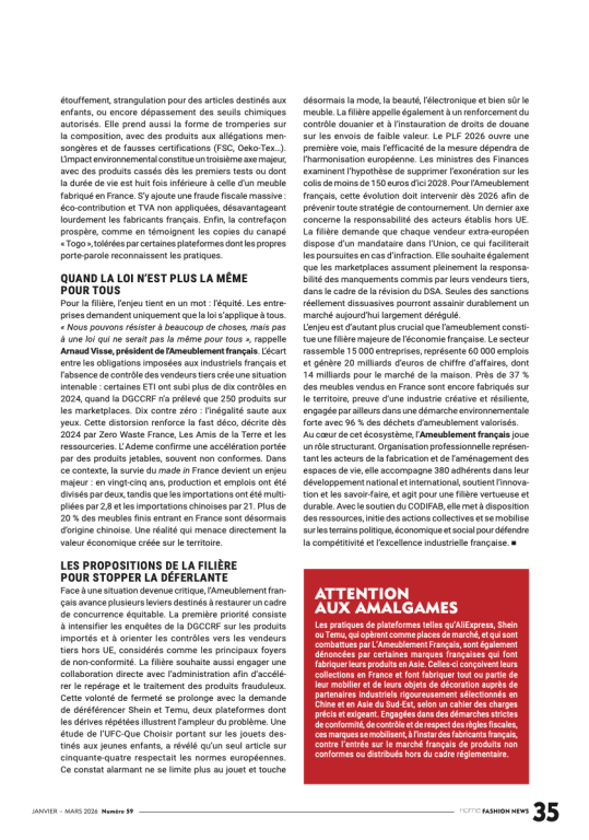 Les pratiques de plateformes telles qu’AliExpress, Shein ou Temu, qui opèrent comme places de marché et qui sont combattues par l’Ameublement français, sont également dénoncées par certaines marques françaises, qui font fabriquer leurs produits en Asie. Celles-ci conçoivent leurs collections en France et font fabriquer tout ou partie de leur mobilier et de leurs objets de décoration auprès de partenaires industriels rigoureusement sélectionnés en Chine et en Asie du Sud-Est, selon un cahier des charges précis et exigeant. Engagées dans des démarches strictes de conformité, de contrôle et de respect des règles fiscales, ces marques se mobilisent, à l’instar des fabricants français, contre l’entrée sur le marché français de produits non conformes ou distribués hors du cadre réglementaire.