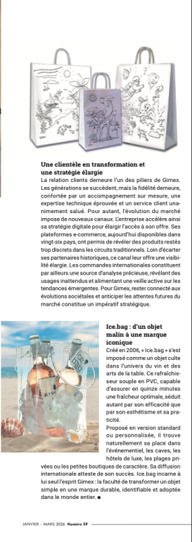 Créée en 2006, « Ice bag » s’est imposé comme un objet culte dans l’univers du vin et des arts de la table. Ce rafraîchisseur souple en PVC, capable d’assurer en quinze minutes une fraîcheur optimale, séduit autant par son efficacité que par son esthétisme et sa praticité. Proposé en version standard ou personnalisée, il trouve naturellement sa place dans l’événementiel, les caves, les hôtels de luxe, les plages privées ou les petites boutiques de caractère. Sa diffusion internationale atteste de son succès. Ice bag incarne à lui seul l’esprit Gimex : la faculté de transformer un objet simple en une marque durable, identifiable et adoptée dans le monde entier.