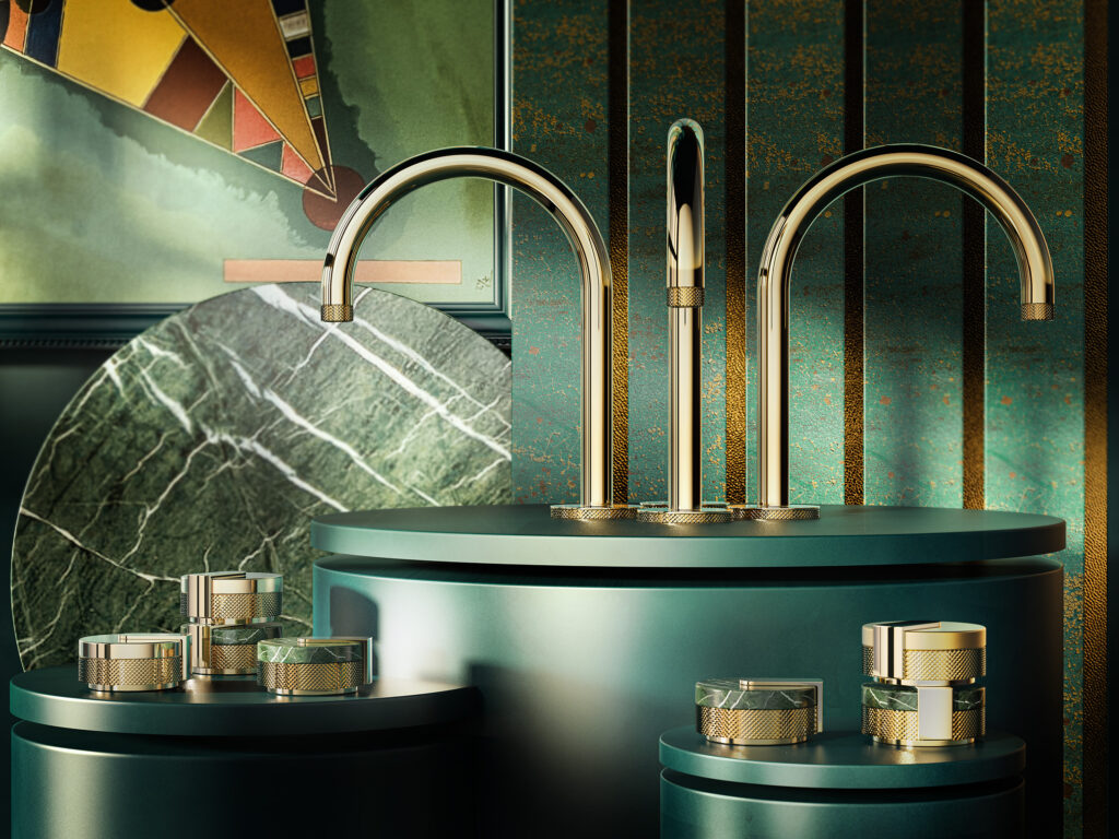 Parmi les collections phares, « Caméo » illustre une élégance intemporelle, où le moletage souligne l’équilibre des formes et des proportions. Plus architecturale, « Riva » affirme son caractère au contact du marbre ou du bois naturel, jouant sur les contrastes et la profondeur des surfaces minérales. Avec « Incanto Arté », le minimalisme se nuance de détails texturés subtils, tandis que « Mod+ » pousse plus loin la personnalisation en offrant une infinité de combinaisons de motifs et de finitions, plaçant le sur-mesure au cœur du projet.
