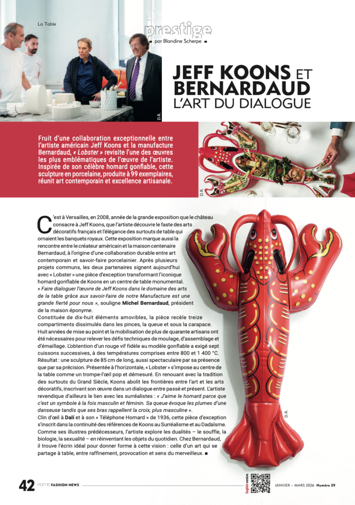 It was in Versailles, in 2008—the year of the major exhibition dedicated to Jeff Koons at the château—that the artist discovered the splendour of French decorative arts and the elegance of the table centrepieces that once adorned royal banquets. This exhibition also marked the meeting between the American creator and the century-old Bernardaud house, giving rise to a lasting collaboration between contemporary art and porcelain savoir-faire. After several joint projects, the two partners now present Lobster, an exceptional piece that transforms Koons’s iconic inflatable lobster into a monumental table centrepiece. “Bringing Jeff Koons’s work into the realm of the table arts through the expertise of our Manufactory is a great source of pride for us,” emphasises Michel Bernardaud, President of the eponymous house.