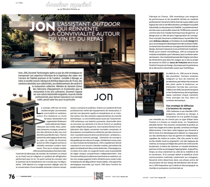 Avec JON, Socamel Technologies opère un pas de côté stratégique en transposant son expertise historique de la logistique des repas vers l’univers de l’habitat premium et de l’outdoor. Installée à Renage, en Isère, la société conçoit, fabrique et distribue depuis plus de 70 ans des solutions destinées aux collectivités, aux établissements de santé et à la restauration collective.