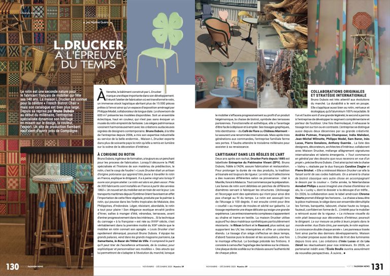 En conjuguant authenticité, innovation et esthétique, L. Drucker confirme son statut d’ambassadrice du savoir-faire artisanal français, inscrivant le rotin dans la modernité sans jamais rompre avec son âme d’origine.