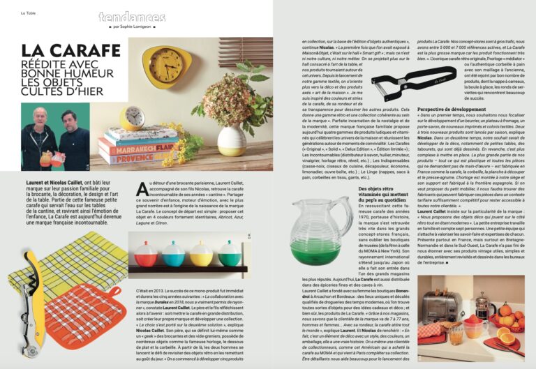 Laurent Caillet a fondé avec sa femme les boutiques Bonendroi à Arcachon et Bordeaux : des lieux uniques et décalés qualifiés de drogueries des temps modernes, où l’on trouve toutes sortes d’objets pour des idées cadeaux et déco ; et bien sûr, les produits de La Carafe. « Grâce à nos magasins, nous savons que la clientèle de la marque va de 7 à 77 ans, hommes et femmes… Avec sa rondeur, la carafe attire tout le monde », explique Laurent. Et Nicolas de renchérir : « En fait, c’est un élément de déco avec un style, des couleurs, un emballage, elle a une vraie histoire. On a même une clientèle de collectionneurs, comme cet Américain qui a acheté la carafe au MOMA et qui vient à Paris compléter sa collection. Être détaillants nous aide beaucoup pour le lancement des produits La Carafe. Nos concept-stores sont à gros trafic, nous avons entre 5 000 et 7 000 références actives, et La Carafe est la plus grosse marque car les produit fonctionnent très bien. ». L’iconique carafe rétro originale, l’horloge « médiator » ou l’authentique corbeille à pain avec son maillage à l’ancienne, ont été rejoint par bon nombre de produits, dont la nappe à carreaux, la boule à glace, les ronds de serviettes qui rencontrent beaucoup de succès.