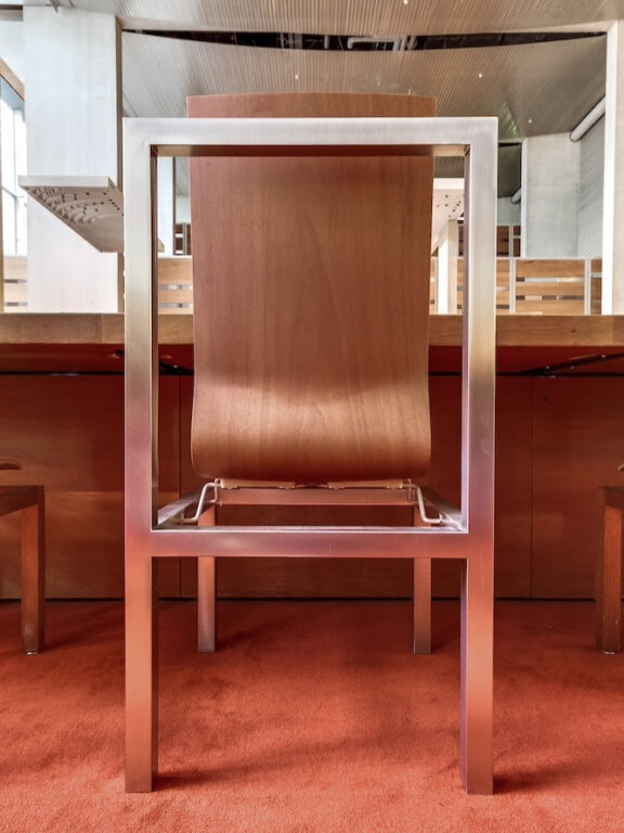 Éditée aujourd’hui par Coedition, la chaise se distingue par une structure en métal associée à une assise en bois, jouant sur l’équilibre, la légèreté visuelle et la tension des lignes. Un objet technique, radical et silencieux, dont le dessin dialogue avec le vide et favorise concentration et usage, en parfaite cohérence avec l’esprit du lieu pour lequel il a été créé.