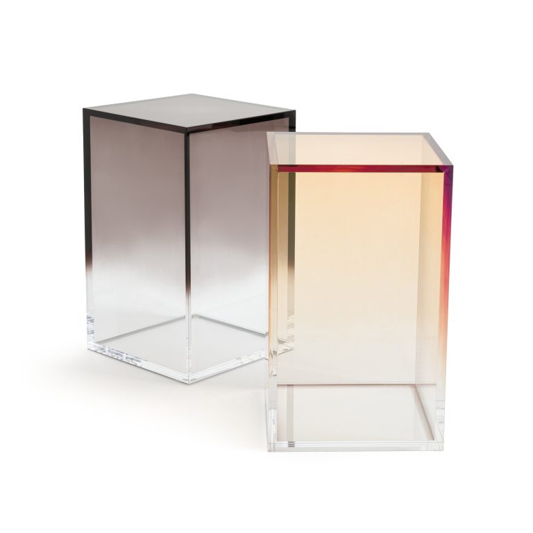 2/ Bout de canapé acrylique dégradé « Akrili » couleur gris fumé et miel ambré 359 € TTC