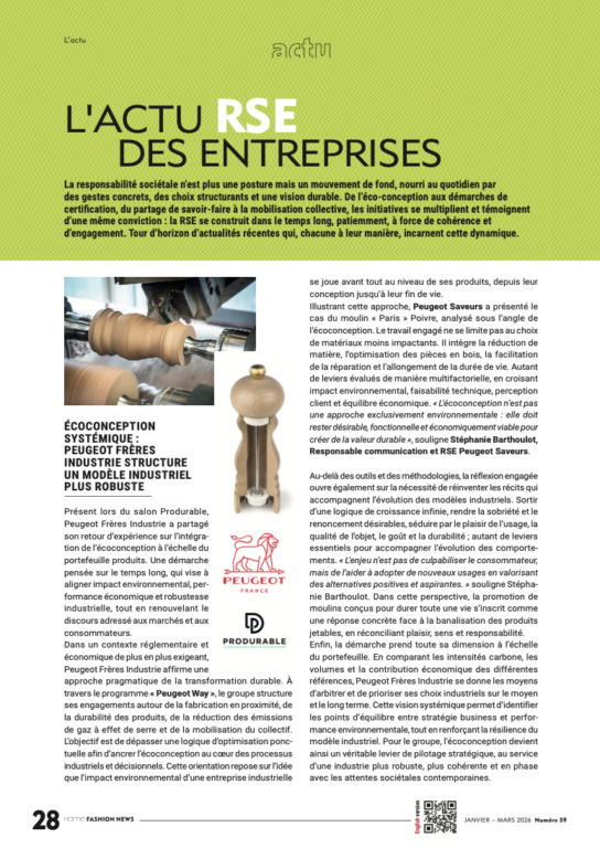 La responsabilité sociétale n’est plus une posture mais un mouvement de fond, nourri au quotidien par des gestes concrets, des choix structurants et une vision durable. De l’éco-conception aux démarches de certification, du partage de savoir-faire à la mobilisation collective, les initiatives se multiplient et témoignent d’une même conviction : la RSE se construit dans le temps long, patiemment, à force de cohérence et d’engagement. Tour d’horizon d’actualités récentes qui, chacune à leur manière, incarnent cette dynamique.