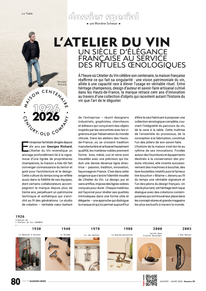 As L’Atelier du Vin celebrates its centenary, the French house reaffirms what makes it unique: a heritage-driven vision of wine combined with a rare ability to elevate use into a true ritual. Drawing on its Champagne roots, author-led design, and artisanal expertise cultivated in northern France, the brand retraces one hundred years of innovation through a collection of objects. These objects tell the story not only of wine itself, but also of the art of tasting it.