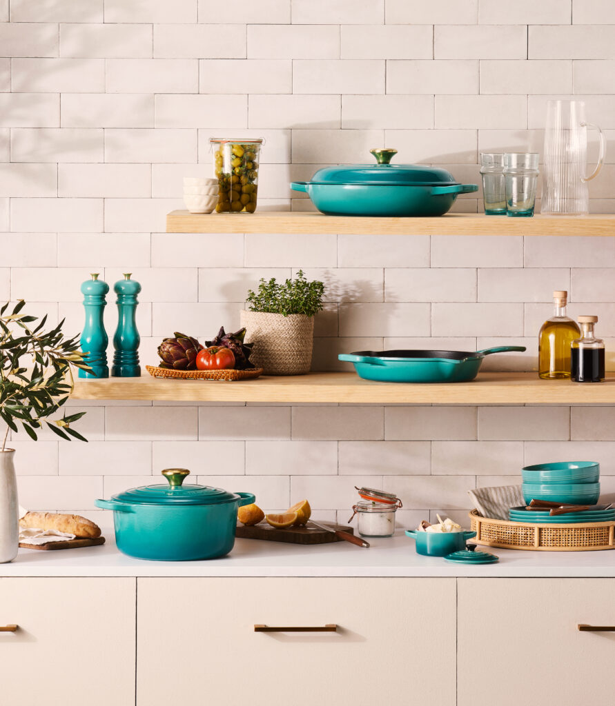 Déployée sur une large sélection de pièces emblématiques en fonte émaillée — cocottes, faitouts et skillets — ainsi que sur des collections en céramique et de l’art de la table, « Bleu Riviera » accompagne aussi bien les plats mijotés que les moments du quotidien. Associée à des tons neutres ou contrastée avec des couleurs plus audacieuses, elle apporte une énergie fraîche et contemporaine aux intérieurs.