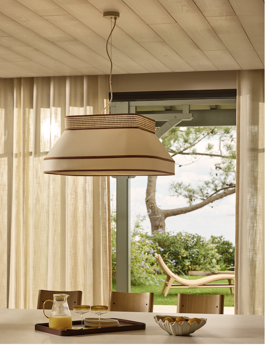 Déclinée en suspensions, appliques, lampes et lampadaires, la collection associe métal brossé, coton crème et papier tressé certifié FSC. Les contrastes de matières et de lignes créent un équilibre subtil entre rigueur moderniste et chaleur décorative, tandis que les abat-jour rappellent les stores en fibres naturelles filtrant la lumière.