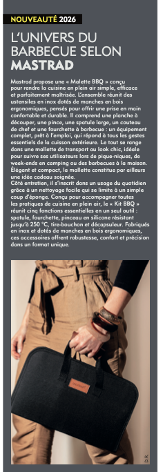 Mastrad introduces the “BBQ Case”, designed to make outdoor cooking simple, efficient and perfectly controlled. The set brings together stainless-steel utensils fitted with ergonomic wooden handles, designed to offer a comfortable and durable grip. It includes a cutting board, tongs, a wide spatula, a chef’s knife and a barbecue fork: a complete, ready-to-use equipment covering all the essential gestures of outdoor cooking. Everything is stored in a chic transport case, ideal for picnics, camping weekends or home barbecues.