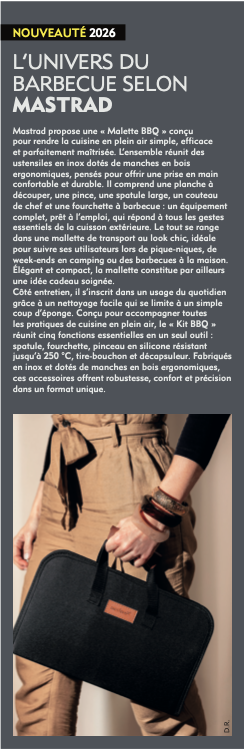 Mastrad propose une « Mallet BBQ » conçue pour rendre la cuisine en plein air simple, efficace et parfaitement maîtrisée. L’ensemble réunit des ustensiles en inox dotés de manches en bois ergonomiques, pensés pour offrir une prise en main confortable et durable.