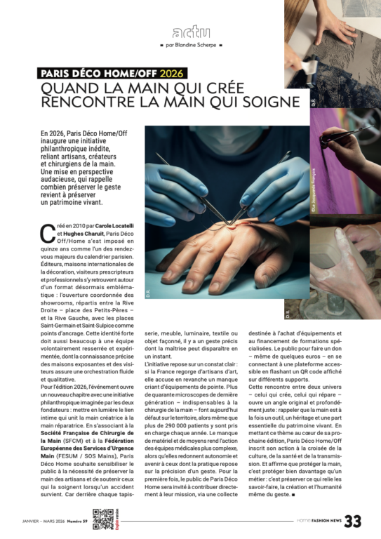 Cette rencontre entre deux univers – celui qui crée, celui qui répare – ouvre un angle original et profond : ne pas opposer la main esthétique à la main fonctionnelle, mais les réunir autour d’un même enjeu. En mettant ce thème au cœur de sa prochaine édition, Paris Déco Home/Off inscrit son action à la croisée de la culture, de la santé et de la transmission. Et affirme qu’en protégeant la main, c’est protéger bien davantage qu’un métier : c’est préserver ce qui relie les savoir-faire, la création et l’humanité même du geste.