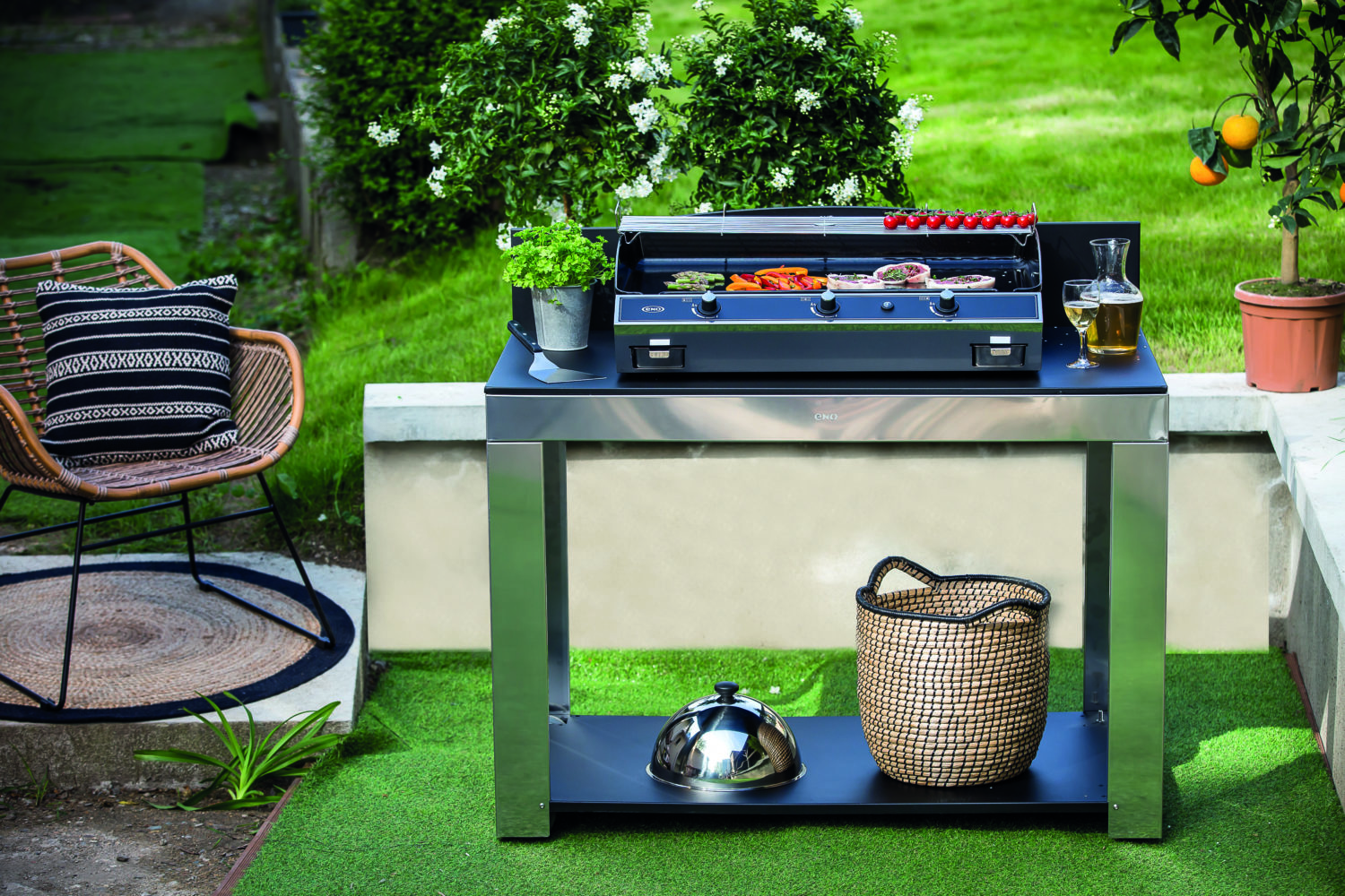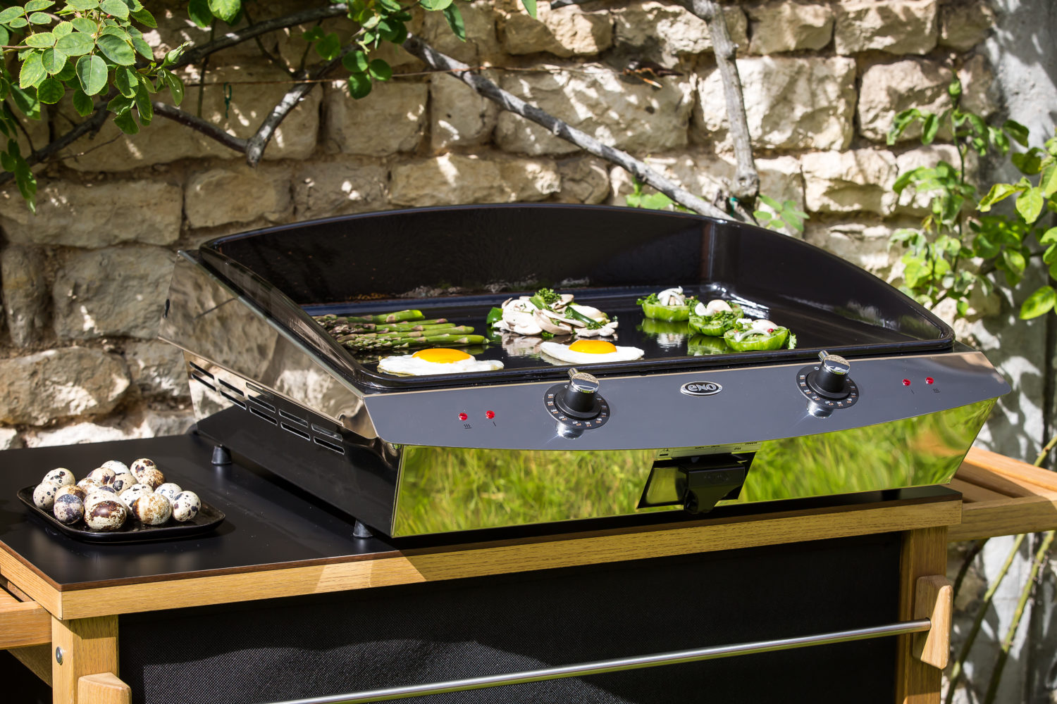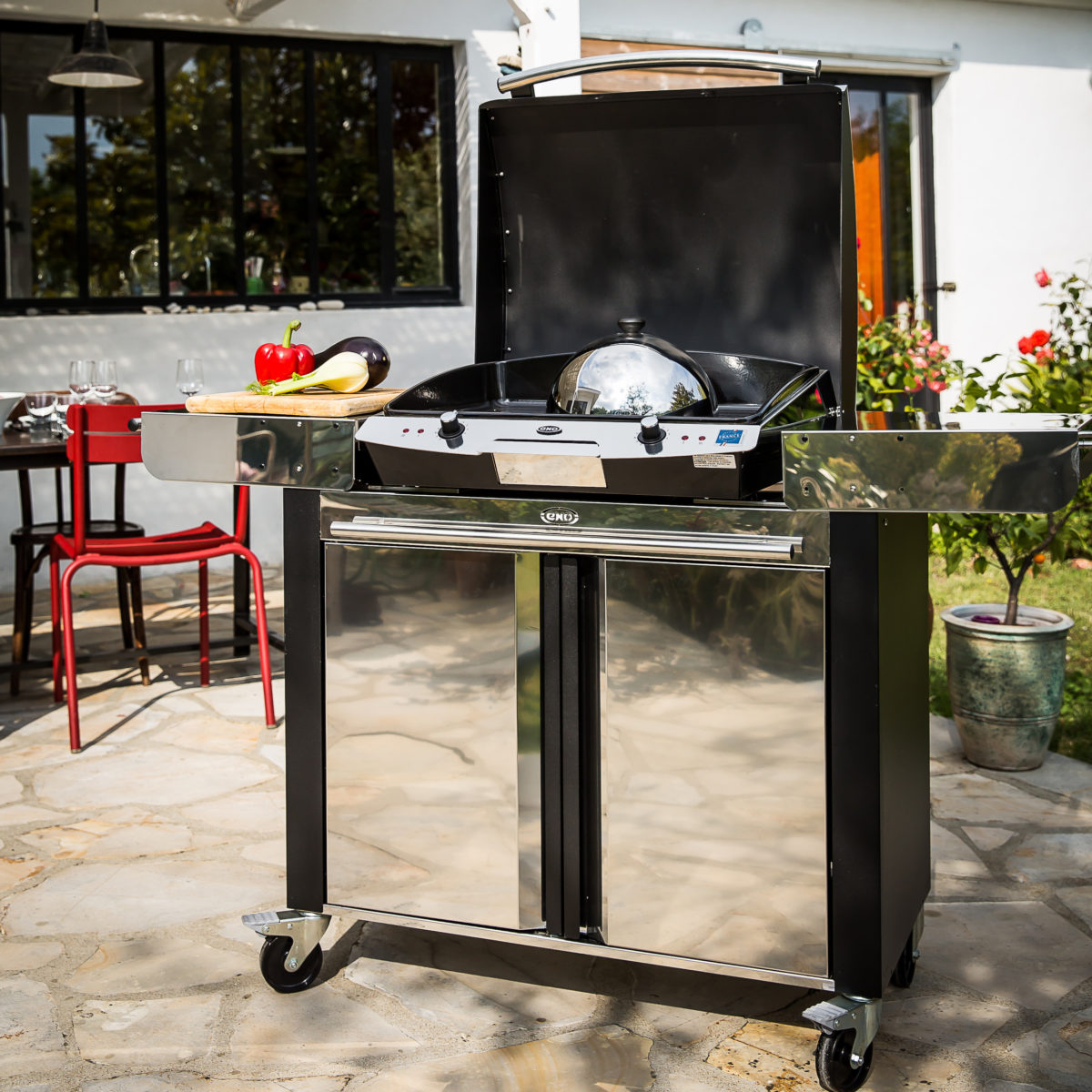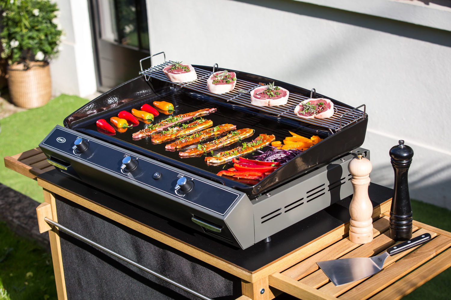 Pourvues d’une large plaque en fonte émaillée, les planchas ENO offrent la possibilité de pouvoir tout cuisiner à l’extérieur et invitent à la créativité. Grosses pièces de viande, crustacés, œufs et même fruits et légumes peuvent y être cuisinés séparément ou en même temps. La place est même suffisamment grande pour poser en plus sur la plancha une casserole pour réaliser une sauce ou cuire au bain-marie. Grâce à la diffusion homogène de la chaleur, la plancha se révèle idéale pour la cuisson des aliments délicats. Plus besoin de patienter des heures pour enclencher la braise, équipées de brûleurs à gaz à haut rendement, les planchas ENO chauffent en quelques minutes. La puissance des brûleurs permet de plus de réaliser des économies d’énergie en réduisant la consommation de gaz de 20%.Spécialiste de l’émaillage depuis 100 ans, ENO applique sur ses planchas un émaillage multicouche lisse et anti-adhérent qui garantit une saisie parfaite des aliments sans ajout de matière grasse. En plus d’assurer la préservation des valeurs nutritionnelles des aliments, cela permet une absence de contact entre la préparation et la flamme et empêche la création de fumées désagréables et nocives. Les graisses des aliments sont récupérées dans un bac récupérateur compatible avec le lave-vaisselle. Robuste et fiable, la plaque en fonte épaisse de 7 mm – conçue par ENO – permet une excellente répartition de la chaleur, indispensable pour maitriser les cuissons. Grâce au régulateur de chaleur (de 80° à 360°), les cuissons sont précises et modulables et les aliments sont saisis pour rester moelleux et grillés. L’émail lisse multi-couches empêchant les aliments d’adhérer, les cuissons peuvent s’enchaîner facilement.