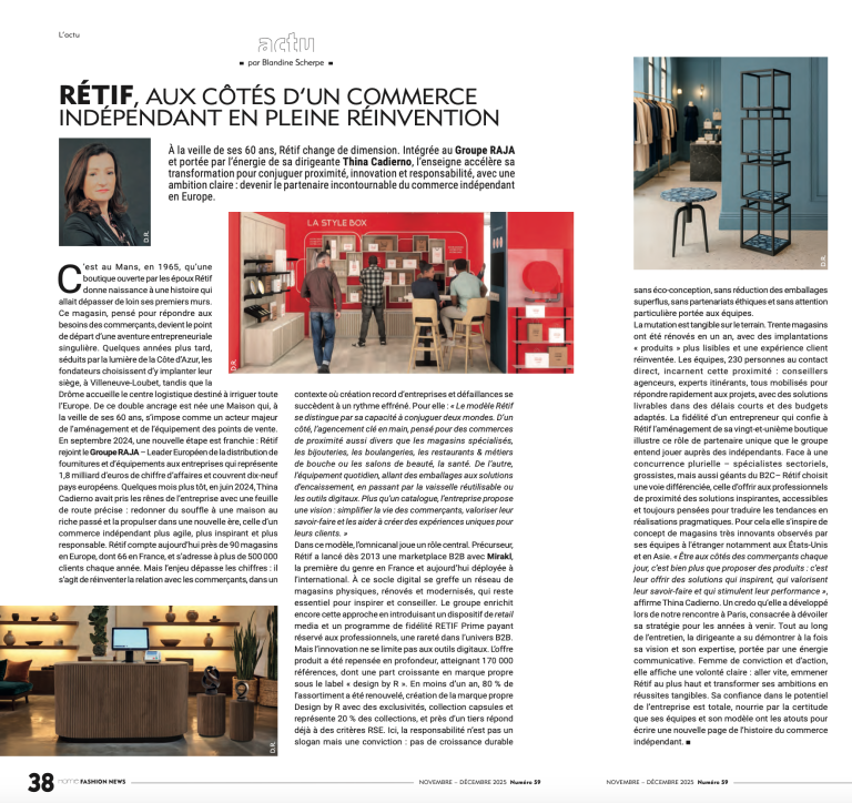 C’est au Mans, en 1965, qu’une boutique ouverte par les époux Rétif donne naissance à une histoire qui allait dépasser de loin ses premiers murs. Ce magasin, pensé pour répondre aux besoins des commerçants, devient le point de départ d’une aventure entrepreneuriale singulière. Quelques années plus tard, séduits par la lumière de la Côte d’Azur, les fondateurs choisissent d’y implanter leur siège, à Villeneuve-Loubet, tandis que la Drôme accueille le centre logistique destiné à irriguer toute l’Europe. Ce double ancrage est devenu une Maison qui, à la veille de ses 60 ans, s’impose comme un acteur majeur de l’aménagement et de l’équipement des points de vente. En septembre 2024, une nouvelle étape est franchie : Rétif rejoint le Groupe Raja – leader européen de la distribution de fournitures et d’équipements aux entreprises qui représente 1,8 milliard d’euros de chiffre d’affaires et couvre dix-huit filiales européennes. Quelques mois plus tôt, en juin 2024, Thina Cadierno, issue des files de l’entreprise avec une vision à la fois fine et très précise : « Redonner du souffle à une maison au riche passé en réaffirmant le sens du service et la fierté d’une mission utile à des milliers d’entreprises et de commerces indépendants », souligne-t-elle.