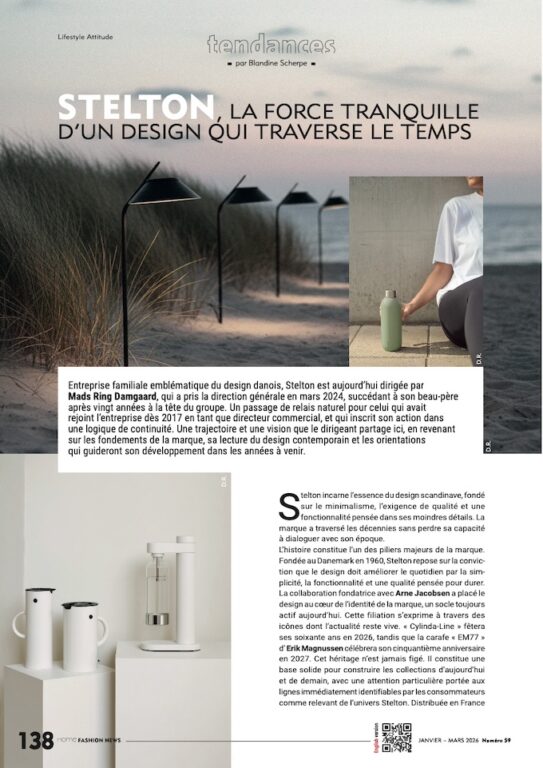 Stelton incarne l’essence du design scandinave, fondé sur le minimalisme, l’exigence de qualité et une fonctionnalité pensée dans ses moindres détails. La marque a traversé les décennies sans perdre sa capacité à dialoguer avec son époque. L’histoire constitue l’un des piliers majeurs de la marque. Fondée au Danemark en 1960, Stelton repose sur la conviction que le design doit améliorer le quotidien par la simplicité, la fonctionnalité et une qualité pensée pour durer. La collaboration fondatrice avec Arne Jacobsen a placé le design au cœur de l’identité de la marque, un socle toujours actif aujourd’hui. Cette filiation s’exprime à travers des icônes dont l’actualité reste vive, « Cylinda-Line » fêtera ses soixante ans en 2026, tandis que la carafe « EM77 » d’Erik Magnussen célébrera son cinquantième anniversaire en 2027. Cet héritage n’est jamais figé. Il constitue une base solide pour construire les collections d’aujourd’hui et de demain, avec une attention particulière portée aux lignes immédiatement identifiables par les consommateurs comme relevant de l’univers Stelton. Distribuée en France par Glob Studio, Stelton séduit une clientèle sensible au design durable et aux objets porteurs de sens, aussi bien dans les concept stores que dans les grands magasins, avec un potentiel particulièrement fort lorsqu’elle bénéficie d’une mise en scène à la hauteur de son héritage.