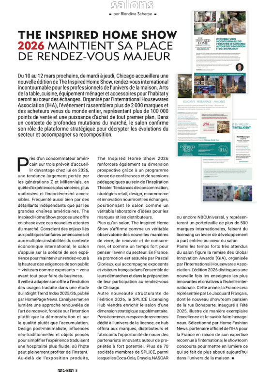 Du 10 au 12 mars prochains, de mardi à jeudi, Chicago accueillera une nouvelle édition de The Inspired Home Show, rendez-vous international incontournable pour les professionnels de l’univers de la maison. Arts de la table, cuisine, équipement ménager et accessoires pour l’habitat y seront au cœur des échanges. Organisé par l’International Housewares Association (IHA), l’événement rassemblera plus de 2 000 marques et des acheteurs venus du monde entier, représentant plus de 100 000 points de vente et une puissance d’achat de tout premier plan. Dans un contexte de profondes mutations du marché, le salon confirme son rôle de plateforme stratégique pour décrypter les évolutions du secteur et accompagner sa recomposition.