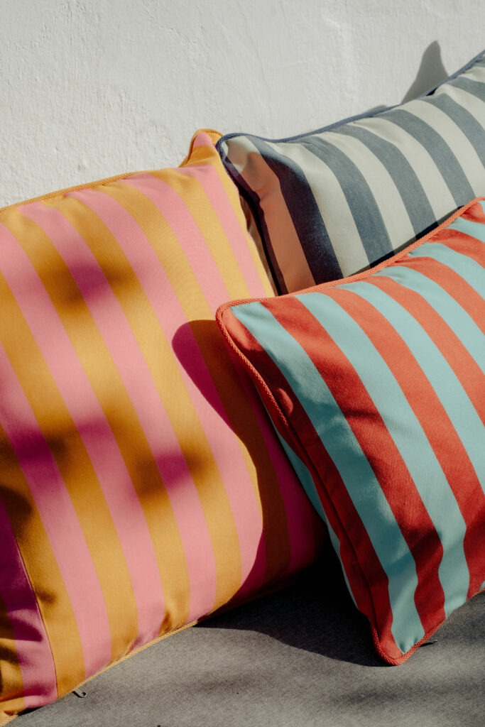 Avec cette première collection Outdoor, Tissage de Luz étend son univers à l’extérieur tout en restant fidèle à son ADN. La lumière devient le fil conducteur d’une gamme où rayures graphiques, teintes lumineuses et matières techniques dialoguent avec naturel. Inspirées de destinations emblématiques de la côte basque — Hossegor, Biarritz, Bidart et Hendaye — les créations évoquent l’esprit des vacances et de la vie en plein air. Conçues en toile acrylique anti-UVA, les matières ont été développées pour résister durablement aux conditions extérieures tout en préservant l’intensité des couleurs. Déclinée en toiles pour pliants, chiliennes et coussins, la collection répond aux nouveaux usages de l’outdoor, entre confort, élégance et liberté.