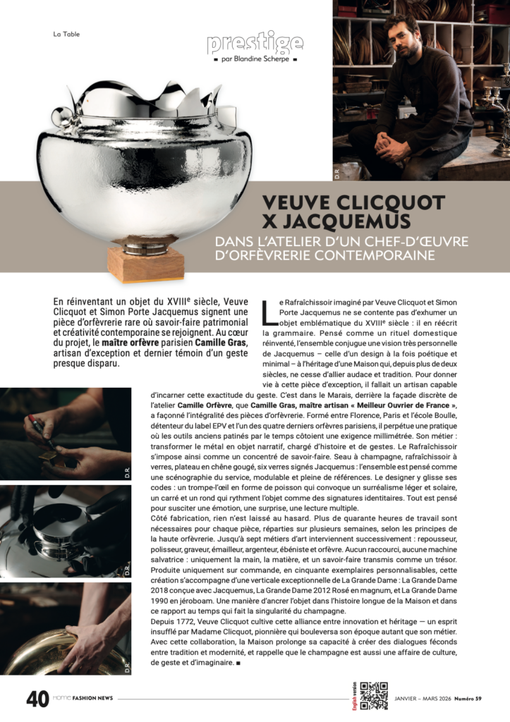 By reinventing an object from the 18th century, Veuve Clicquot and Simon Porte Jacquemus have created a rare piece of silversmithing where heritage craftsmanship and contemporary creativity converge. At the heart of the project is Parisian master silversmith Camille Gras, an exceptional artisan and one of the last custodians of a nearly vanished gesture.