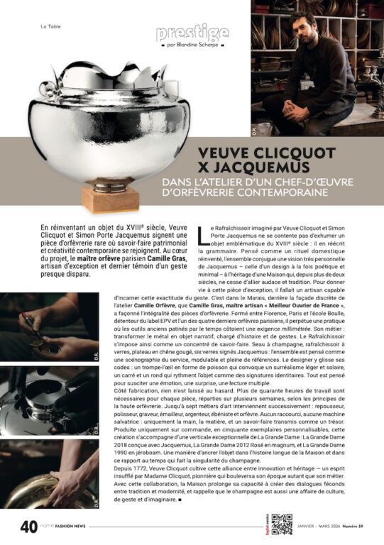 En réinventant un objet du XVIIIe siècle, Veuve Clicquot et Simon Porte Jacquemus signent une pièce d’orfèvrerie rare où savoir-faire patrimonial et créativité contemporaine se rejoignent. Au cœur du projet, le maître orfèvre parisien Camille Gras, artisan d’exception et dernier témoin d’un geste presque disparu.