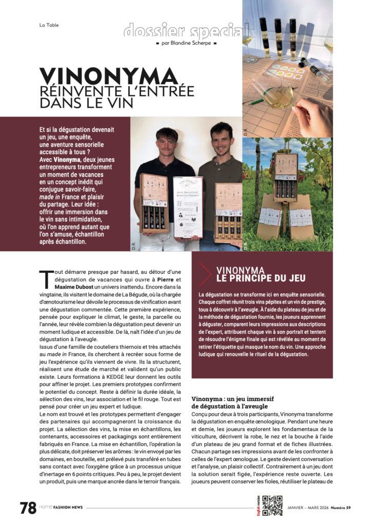 With Vinonyma, two young entrepreneurs transform a vacation moment into an original concept that combines know-how, made-in-France craftsmanship, and the pleasure of sharing. Their idea is to offer an immersion into wine without intimidation, where learning and enjoyment go hand in hand, sample after sample.
